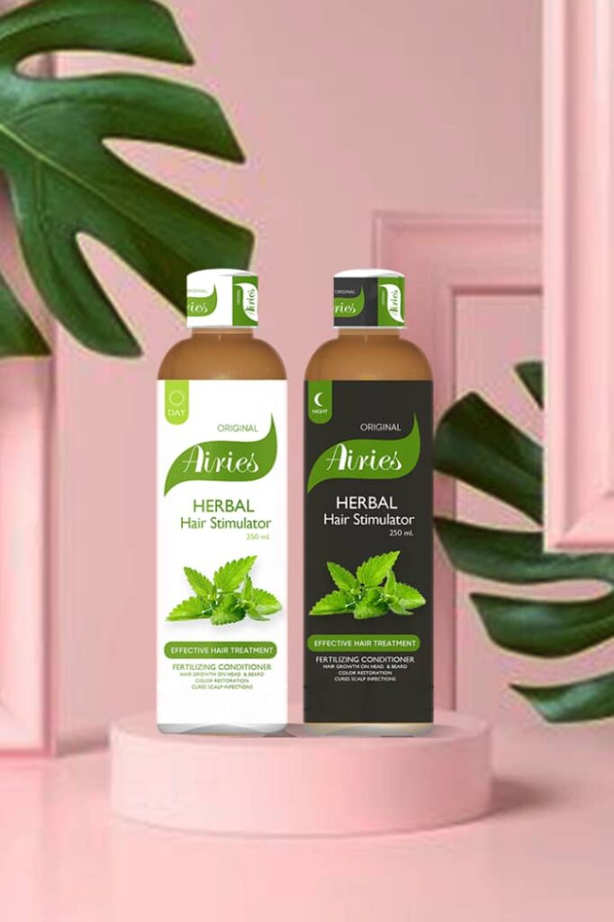 THE MORNING AND NIGHT BOTTLES OF AIRIES HERBAL HAIR STIMULATOR.