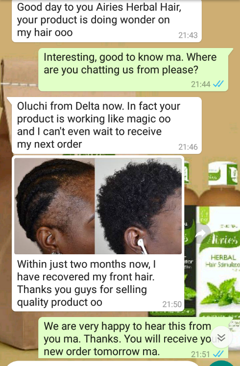 Worry no more because, AIRIES HERBAL HAIR STIMULATOR is here to ease all your concerns pertaining to hair growth and save you from discomfort of of any form of hair irritation such as; hair loss at your front head, bald hair, edges, hair breaking and dandruff. AIRIES HERBAL HAIR STIMULATOR is ready to resuscitate your hair condition with amazing results within six weeks of using.